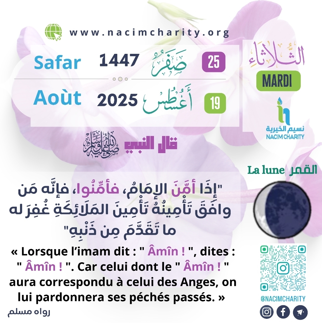 Le Prophète (sur lui paix et salut) nous a ordonné de dire : « Âmîn ! », lorsque l’imam dit : « Âmîn ! » car cela correspond au moment où le font les Anges. Et celui dont la parole : « Âmîn ! » est prononcée en même temps que celle des Anges se verra pardonné ses péchés passés.