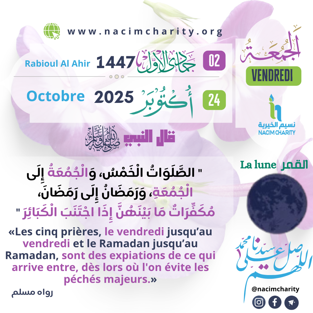 Aboû Hourayrah (qu’Allah l’agrée) relate : » Le Messager d’Allah (qu’Allah le couvre d’éloges et le préserve) disait : »Les cinq prières, le vendredi jusqu’au vendredi et le Ramadan jusqu’au Ramadan, sont des expiations de ce qui arrive entre, dès lors où l’on évite les péchés majeurs. » [Authentique] – [Rapporté par Muslim] – [صحيح مسلم – 233]