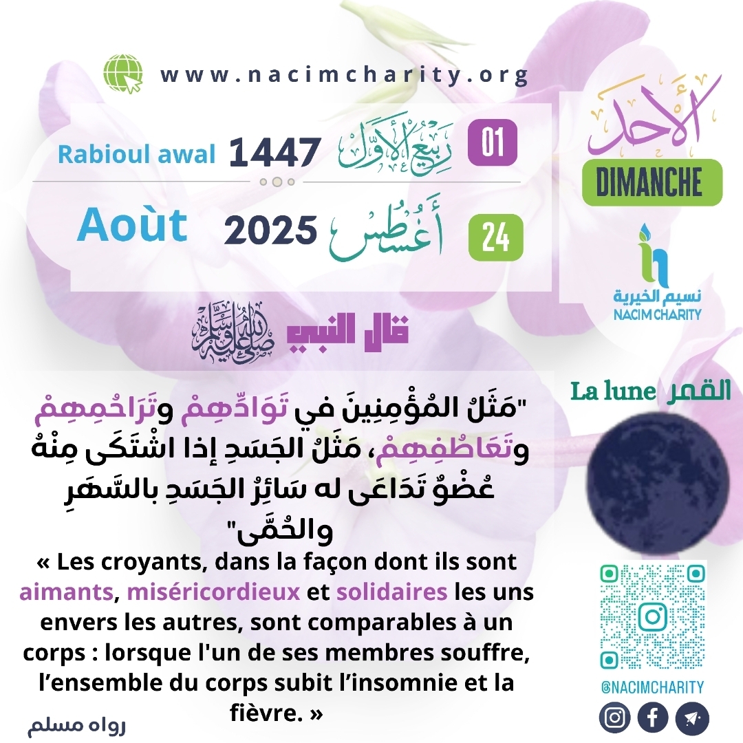 An-Nu’mân ibn Bashîr (qu’Allah l’agrée) rapporte que le Prophète (sur lui la paix et le salut) a dit : « Les croyants, dans la façon dont ils sont aimants, miséricordieux et solidaires les uns envers les autres, sont comparables à un corps : lorsque l’un de ses membres souffre, l’ensemble du corps subit l’insomnie et la fièvre. » [Authentique] – [Rapporté par Al-Bukhârî et Muslim]