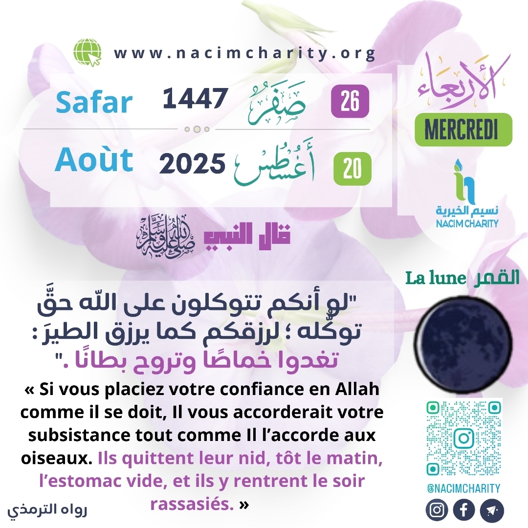 Umar ibn Al-Khaṭṭâb (qu’Allah l’agrée) relate que le Messager d’Allah (sur lui la paix et le salut) a dit : « Si vous placiez votre confiance en Allah comme il se doit, Il vous accorderait votre subsistance tout comme Il l’accorde aux oiseaux. Ils quittent leur nid, tôt le matin, l’estomac vide, et ils y rentrent le soir rassasiés. » [Authentique] – [Rapporté par Ibn Mâjah – Rapporté par At-Tirmidhî – Rapporté par Aḥmad]