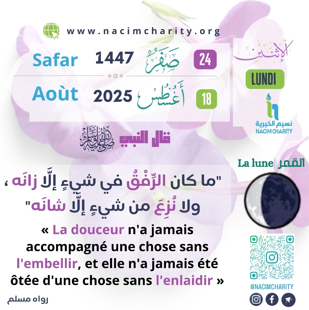 ‘Â`ichah (qu’Allah l’agrée), l’épouse du Prophète (qu’Allah le couvre d’éloges et le préserve) relate qu’il a dit :« La douceur n’a jamais accompagné une chose sans l’embellir, et elle n’a jamais été ôtée d’une chose sans l’enlaidir » [Authentique] – [Rapporté par Muslim]
