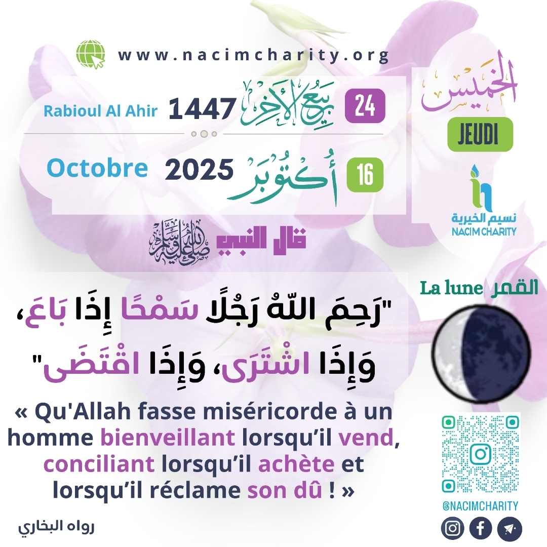 Jâbir (qu’Allah l’agrée) relate que le Messager d’Allah (qu’Allah le couvre d’éloges et le préserve) a dit : » Qu’Allah fasse miséricorde à un homme bienveillant lorsqu’il vend, conciliant lorsqu’il achète et lorsqu’il réclame son dû ! » [Authentique] – [Rapporté par Al-Bûkhârî]