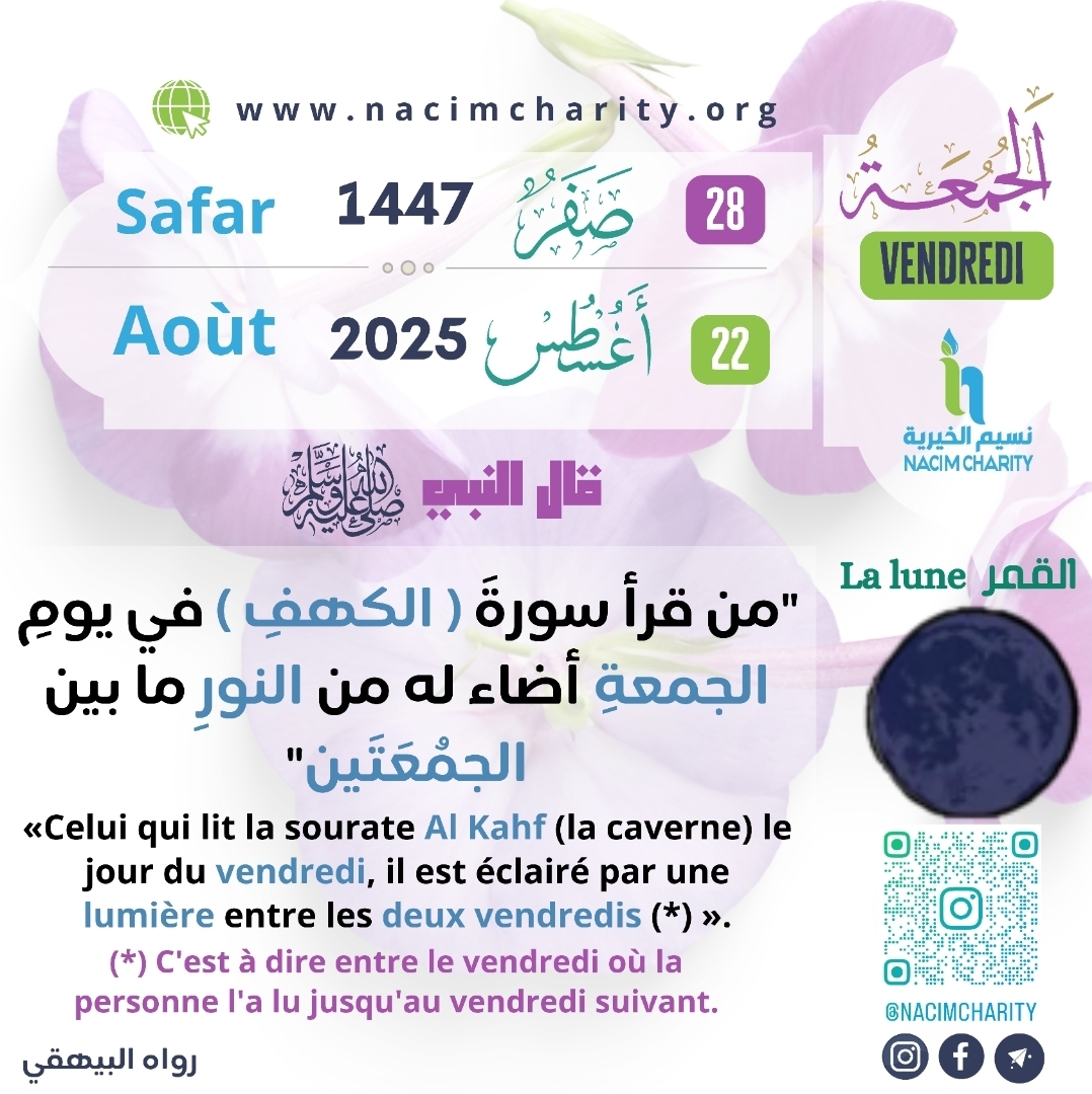 Le Prophète, SallaLaho ‘alayhi wa Sallam a dit : « Quiconque récite la Sourate Al-Kahf (la caverne) le jour du Vendredi, Allah l’éclaire entre les deux vendredis. » Hadith rapporté par An-Nassaï, Al-Hakem et Al-Bayhaqi selon Abou Said al-Khoudari, qu’Allah soit satisfait d’eux, authentifié par Al-Albani