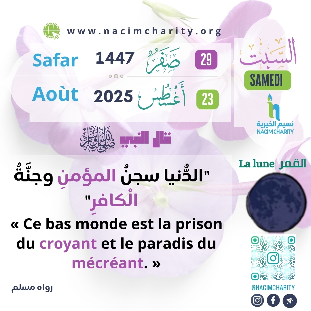 Abû Hurayrah (qu’Allah l’agrée) relate que le Messager d’Allah (sur lui la paix et le salut) a dit : « Ce bas monde est la prison du croyant et le paradis du mécréant. » [Authentique] – [Rapporté par Muslim]