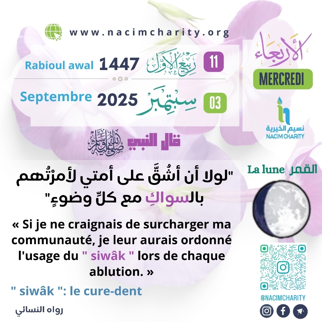 Abû Hurayrah (qu’Allah l’agrée) relate que le Messager d’Allah (sur lui la paix et le salut) a dit : « Si je ne craignais de surcharger ma communauté, je leur aurais ordonné l’usage du » siwâk » lors de chaque ablution. » [Authentique] – [Rapporté par An-Nassâ’î – Rapporté par Aḥmad – Rapporté par Mâlik]