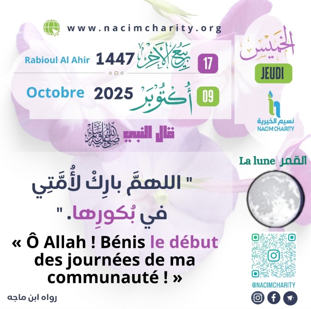 Le Prophète (sur lui la paix et le salut) invoquait Allah, Exalté soit-il, pour qu’Il bénisse le matin et le début des journées de sa communauté afin que ce temps lui soit suffisant pour qu’elle puisse accomplir ses tâches quotidiennes, et que l’œuvre en elle-même soit fructueuse. Que celle-ci concerne la recherche de la subsistance, de la science, de la victoire sur l’ennemi ou quoi que ce soit d’autre. C’est pourquoi le Prophète (sur lui la paix et le salut) envoyait son armée en expédition au début de la journée. De plus, Sakhr ibn Wadâ’ah (qu’Allah l’agrée), quant à lui, était commerçant et il devint très riche et acquit beaucoup de biens grâce à l’invocation du Prophète (sur lui la paix et le salut).