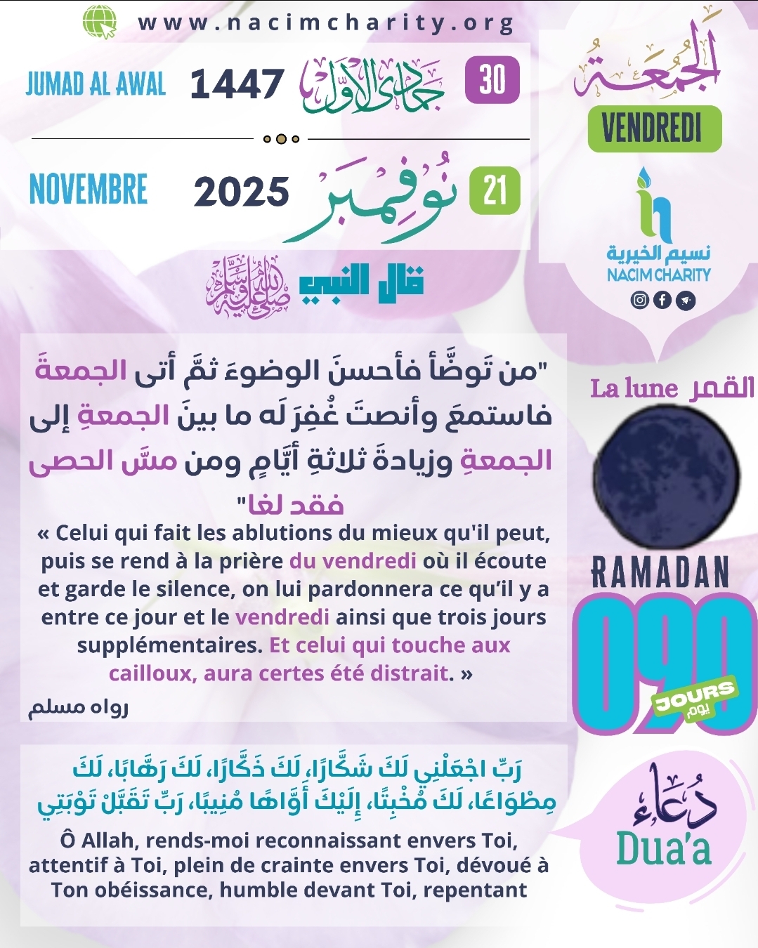 Abû Hurayrah (qu’Allah l’agrée) relate que le Prophète (sur lui la paix et le salut) a dit : « Celui qui fait les ablutions du mieux qu’il peut, puis se rend à la prière du vendredi où il écoute et garde le silence, on lui pardonnera ce qu’il y a entre ce jour et le vendredi ainsi que trois jours supplémentaires. Et celui qui touche aux cailloux, aura certes été distrait. » [Authentique] – [Rapporté par Muslim]