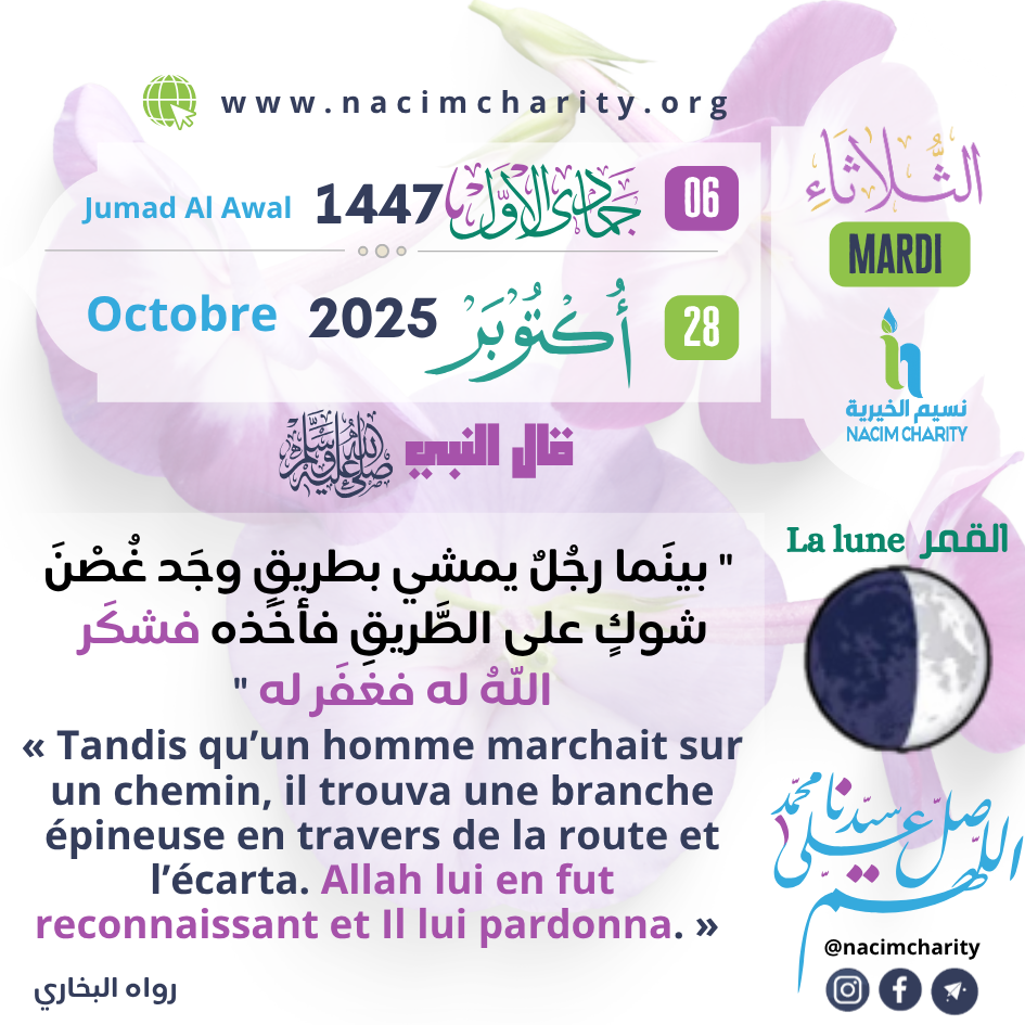 Le Prophète (sur lui la paix et le salut) a dit :« Tandis qu’un homme marchait sur un chemin, il trouva une branche épineuse en travers de la route et l’écarta. Allah lui en fut reconnaissant et Il lui pardonna. »[Authentique] – [Rapporté par Muslim dans ses deux versions – Rapporté par Al-Bukhârî et Muslim]