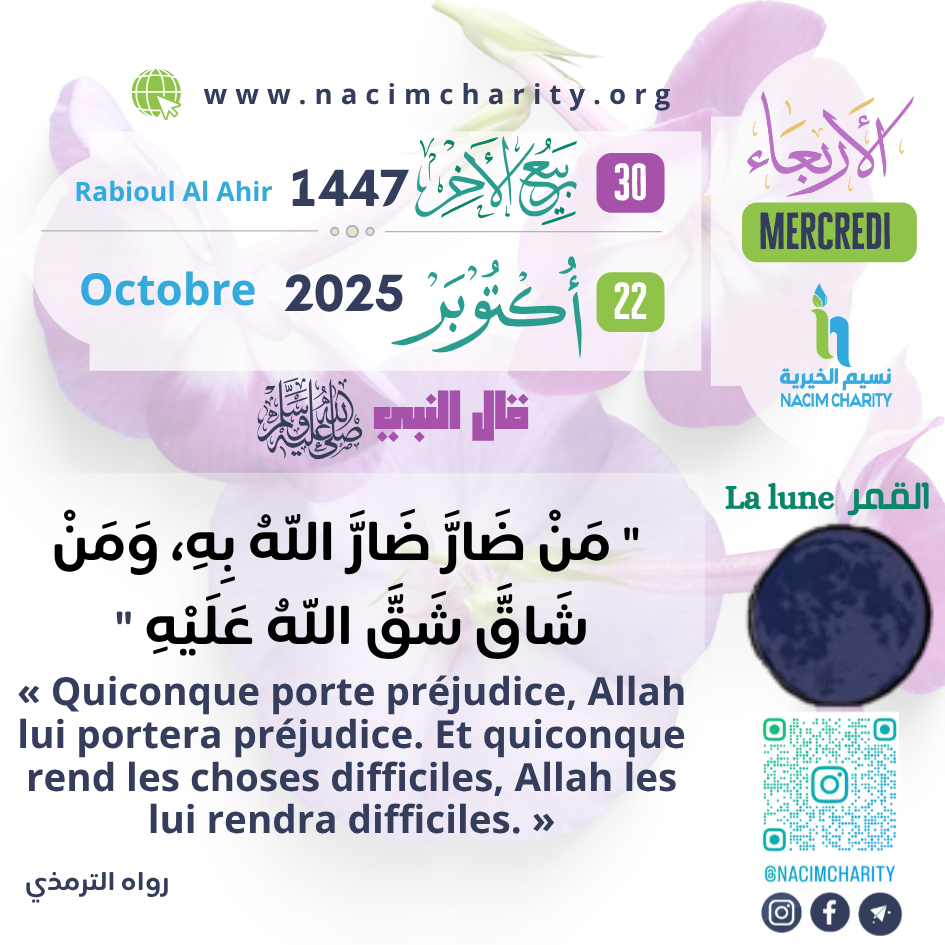 Aboû Ṣirmah (qu’Allah l’agrée) relate que le Messager d’Allah (qu’Allah le couvre d’éloges et le préserve) a dit :« Quiconque porte préjudice, Allah lui portera préjudice. Et quiconque rend les choses difficiles, Allah les lui rendra difficiles. » [Bon] – – [سنن الترمذي – 1940]