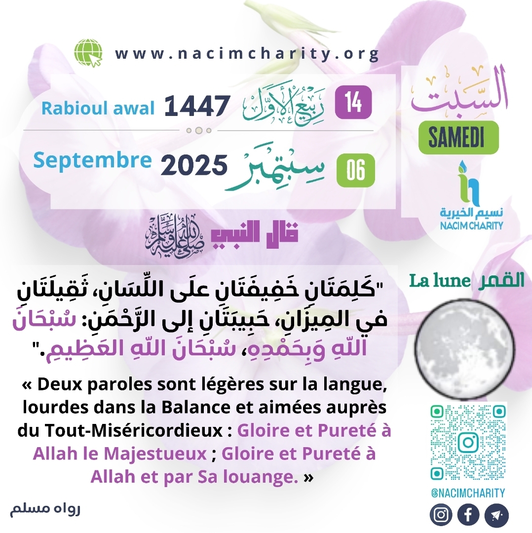 Aboû Hourayrah (qu’Allah l’agrée) relate que le Prophète (qu’Allah le couvre d’éloges et le préserve) a dit :« Deux paroles sont légères sur la langue, lourdes dans la Balance et aimées auprès du Tout-Miséricordieux : Gloire et Pureté à Allah le Majestueux ; Gloire et Pureté à Allah et par Sa louange. » [Authentique] – [Rapporté par Al-Bukhârî et Muslim]