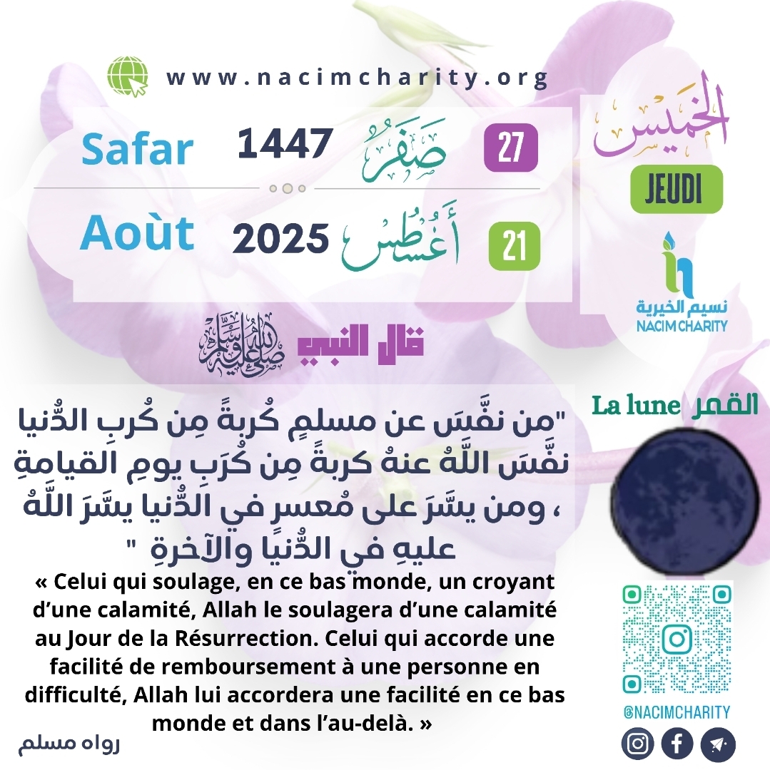 Abû Hurayrah (qu’Allah l’agrée) relate que le Messager d’Allah (sur lui la paix et le salut) a dit : « Celui qui soulage, en ce bas monde, un croyant d’une calamité, Allah le soulagera d’une calamité au Jour de la Résurrection. Celui qui accorde une facilité de remboursement à une personne en difficulté, Allah lui accordera une facilité en ce bas monde et dans l’au-delà. Celui qui couvre les défauts d’un musulman, Allah le couvrira en ce bas monde et dans l’au-delà. Et Allah vient en aide au serviteur tant que celui-ci vient en aide à son frère. Celui qui emprunte une voie à la recherche d’un savoir, Allah lui facilitera grâce à cela une voie vers le Paradis. Il n’est pas de groupe de gens qui se réunissent dans l’une des demeures d’Allah afin d’y réciter le Livre d’Allah et de l’étudier ensemble sans que la sérénité ne descende sur eux, que la miséricorde ne les couvre, que les Anges ne les entourent et qu’Allah ne les mentionne à ceux qui sont auprès de Lui. Quant à celui qui est ralenti par ses œuvres, ce n’est pas sa lignée qui le fera avancer plus vite. » [Authentique] – [Rapporté par Muslim]